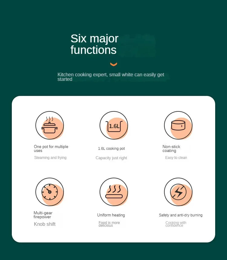 - Quick heating for everyday meals (soups, noodles, porridge, eggs)